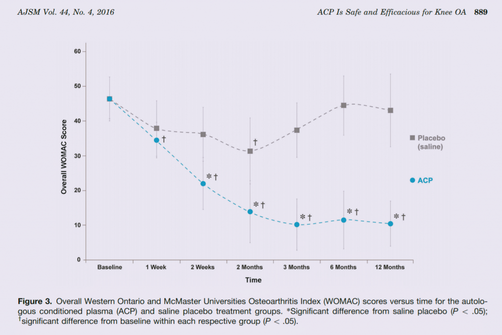 ההשוואה בין הקבוצות נארכה לאורך שנה והתבססה על שאלון WOMAC שבודק רמת כאב, נוקשות ופונציונליות של הברך. בכל אחד מהשלבים היה יתרון משמעותי לקבוצת הPRP לעומת קבוצת הפלצבו, עם שיפור משמעותי בכל נקודת בדיקה. רמת הכאבים ירדה באופן משמעותי גם שנה לאחר הניתוח לעומת קבוצת הביקורת. בגרף שמופיע למטה ניתן לראות את השיפור המשמעותי גם שנה לאחר ההזרקות בקבוצת הPRP (מסומן כACP), ניתן לראות שכחודשיים לאחר ההזרקה חל שיפור גם בקבוצת הבקרה, שיפור שככל הנראה קשור לאפקט הפלצבו.